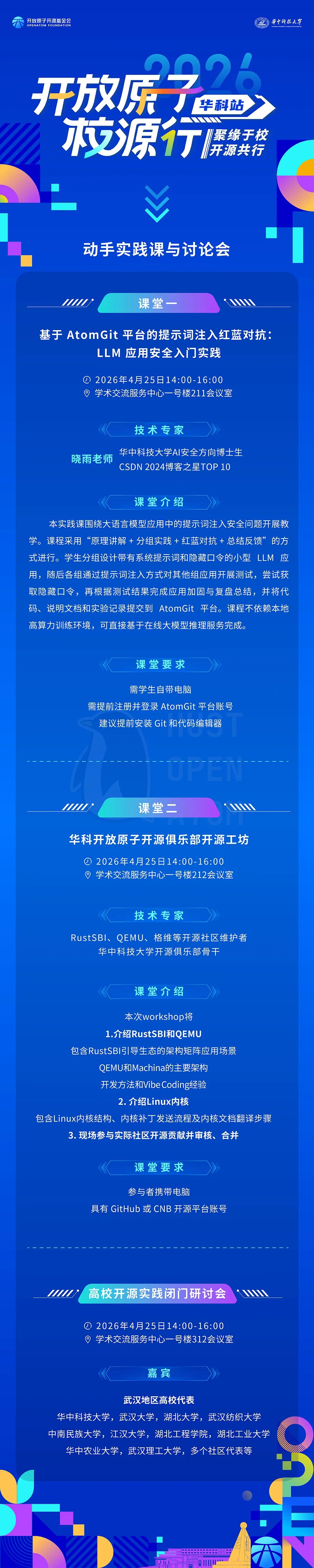 下午活动将同步开展两场开源实践动手课堂,内容涵盖基于AtomGit平台的LLM应用安全实战、开源工坊实践等;同时还将举办武汉地区高校与社区代表参与的“高校开源实践闭门研讨会”,围绕开源人才培养、开源教育实践以及校地、校社协同等议题展开深入交流。