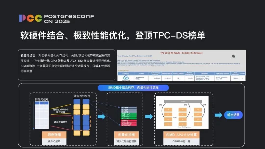 面向HTAP场景,TDSQL PG/OpenTenBase构建了以协调节点(CN)为核心的分布式执行框架,结合自研的DOP并行调度机制与Push-based分片交互协议,进一步优化执行效率。其基于时间戳的事务设计使高并发OLTP性能提升超50%。同时,通过软硬件协同优化,TDSQL PG成功登顶国际权威基准测试TPC-DS榜单,彰显其极致性能实力。