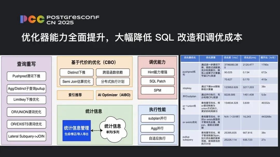 在性能优化方面,TDSQL PG/OpenTenBase的查询优化器能力全面升级。通过pushpred谓词下推、OR转UNION拆分、代价模型评估等优化器增强技术,复杂查询性能提升达五倍以上。结合AI大模型进行索引推荐与执行计划优化,为去O迁移提供了强有力的技术支撑。